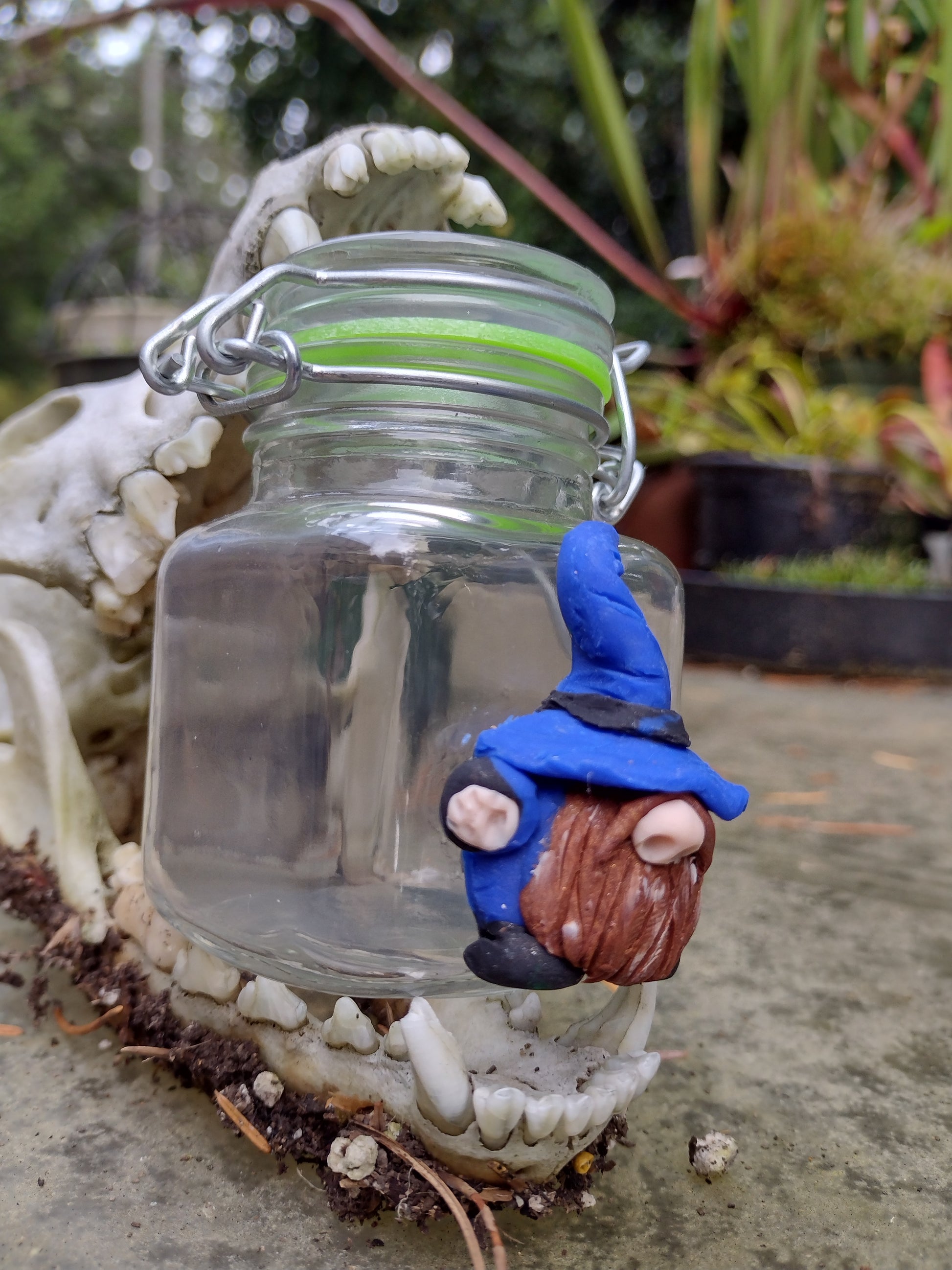 3oz glass jar (aprox 2"x 3"), polymer clay gnome